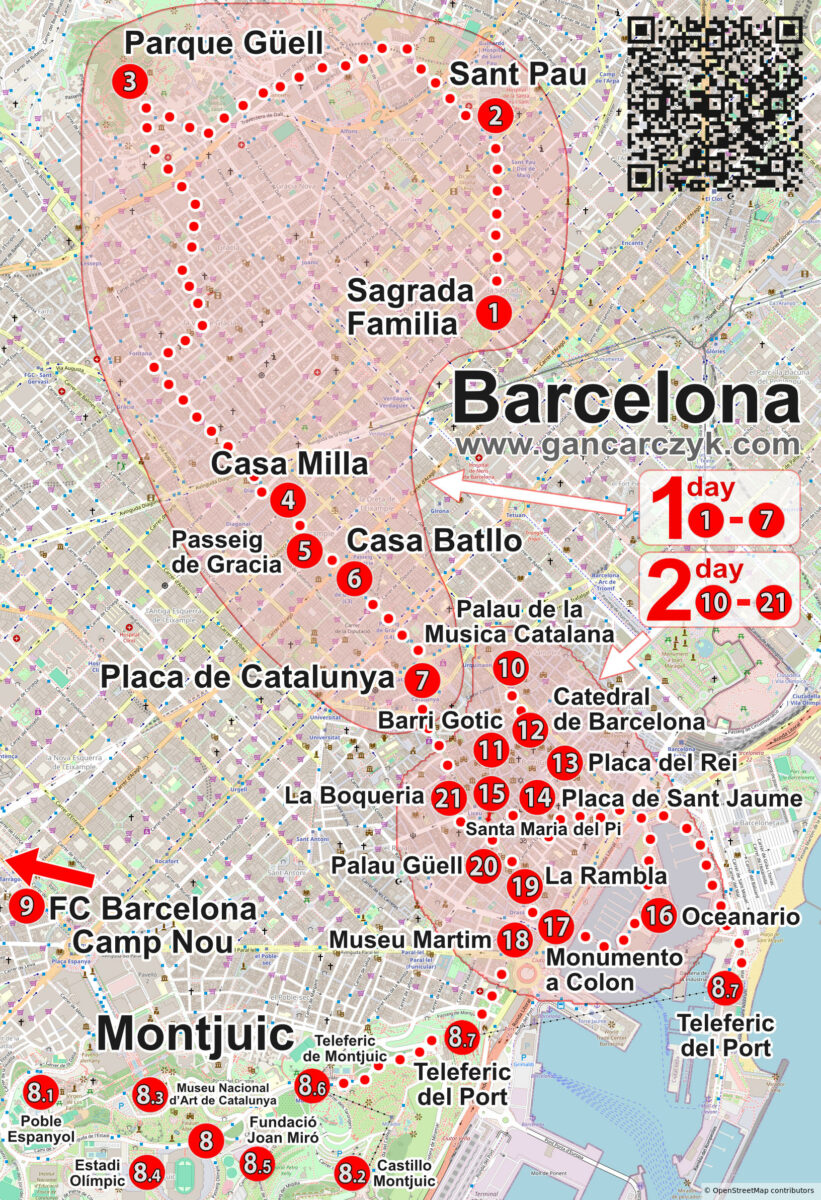 Plan zwiedzania dostępny jest również w formie interaktywnej mapy PDF. Możesz pobrać ją bezpłatnie! Mapę wraz z krótką instrukcją jej użytkowania znajdziesz we wpisie: Barcelona – interaktywna MAPA PDF – [klik]