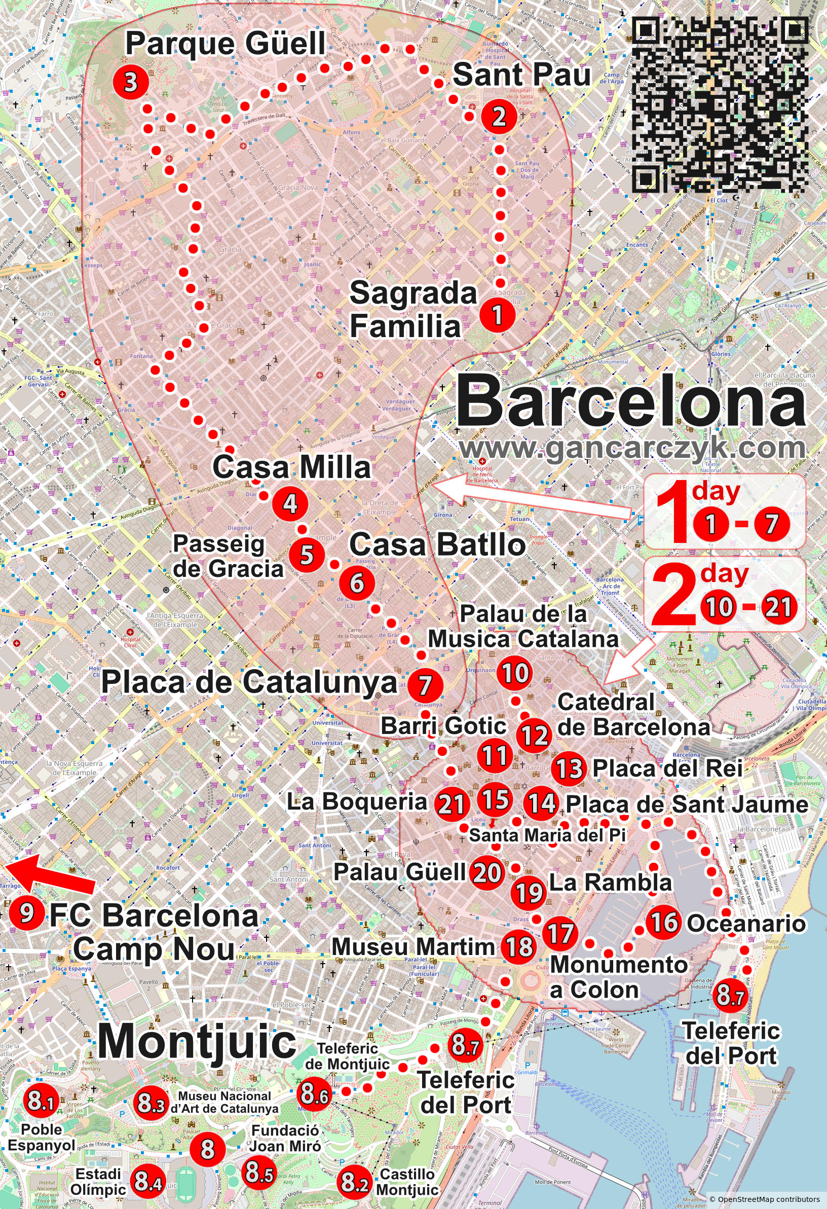 Plan zwiedzania dostępny jest również w formie interaktywnej mapy PDF. Możesz pobrać ją bezpłatnie! Mapę wraz z krótką instrukcją jej użytkowania znajdziesz we wpisie: Barcelona – interaktywna MAPA PDF – [klik]