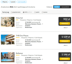 Fragment zestawienia ofert biur podróży z wakacje.pl, wygenerowany w 27 sierpnia 2019. Kryterium: Majorka, samolotem, od najtańszych.