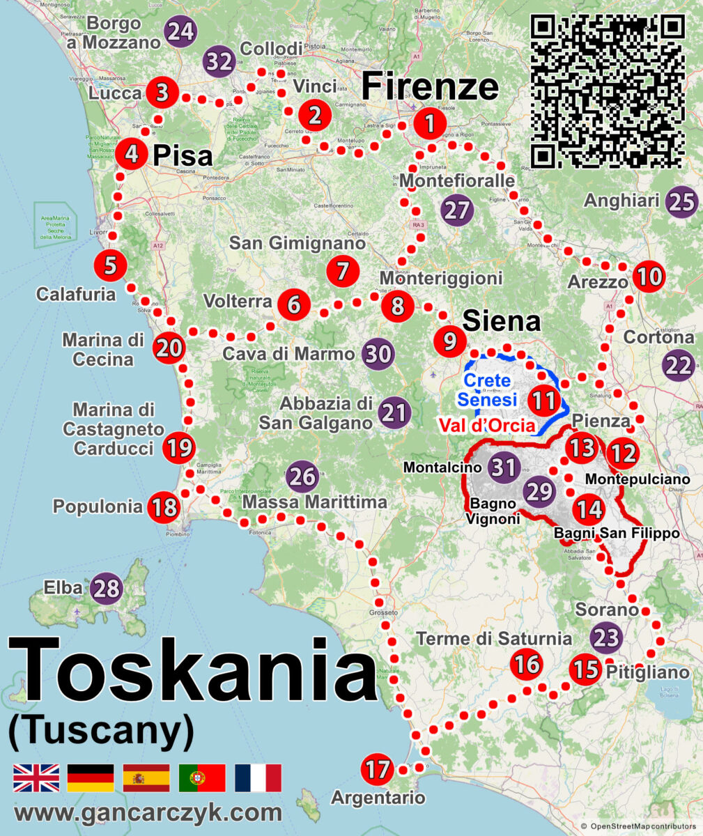Plik do pobrania (bezpłatny) wraz z krótką instrukcją jak wycisnąć 100% z mapy PDF znajdziesz w osobnym wpisie: Toskania mapa PDF – [klik].